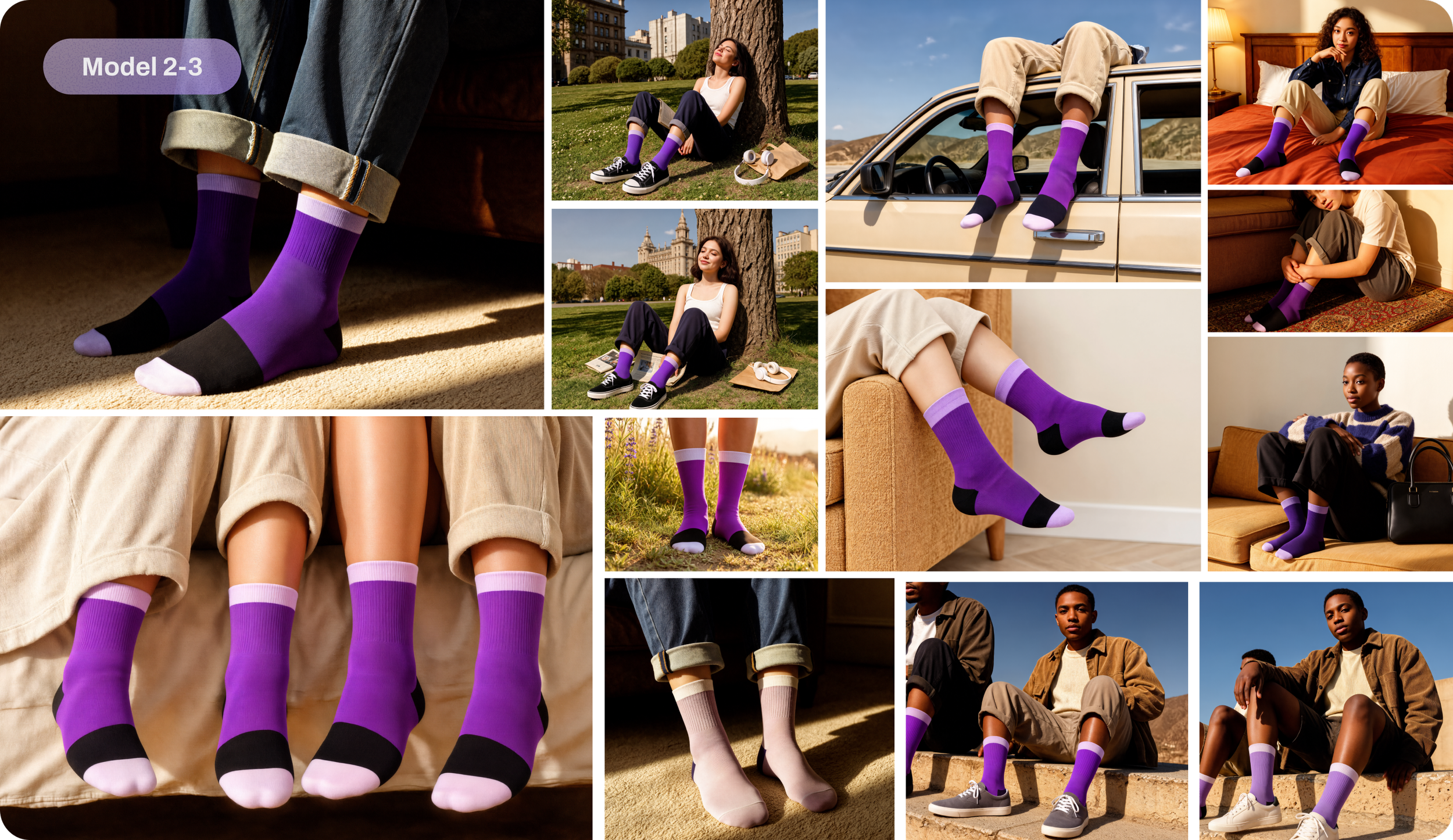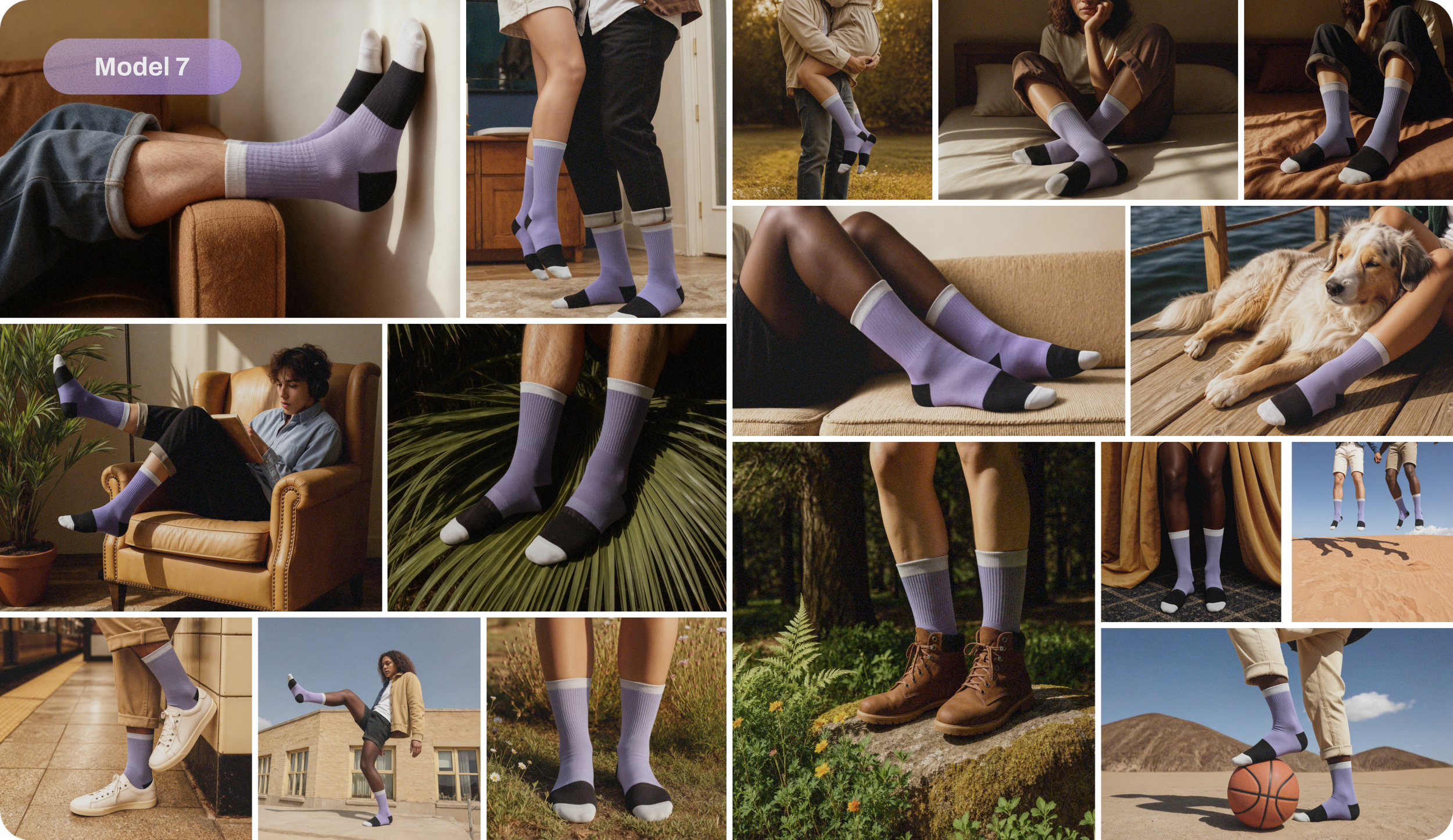 Style: Lifestyle photography with unexpected poses for a sock brand.